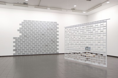 anschlussfähig | 2024 | prints on cardboard, wood, glass, color | 300 x 500 cm | raum für gäste