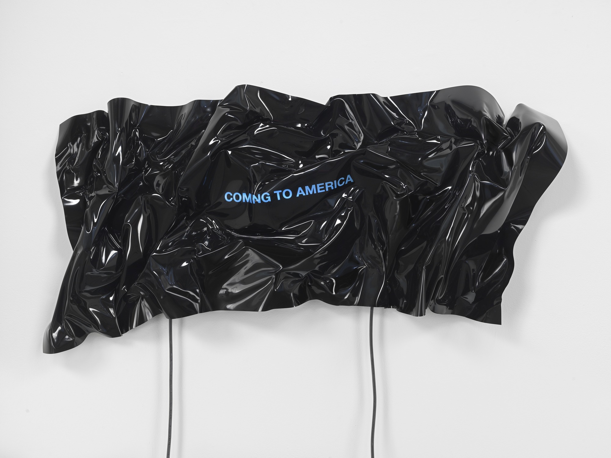 Sprüth Magers is pleased to present Gretchen Bender’s series Top Ten Grossing Films of 1988 at the Berlin gallery, shown for the first time since their 1989 debut. The ten sculptures, made of black crumpled heat-set vinyl and backlit by neon, illuminate the titles of 1988’s highest-grossing films, compiled by Bender during her constant scrutinising of the daily Hollywood magazine, Variety. Driven by her desire to never be a step behind the popular culture her art was critiquing, Bender began her research into Variety for industry production notes about upcoming films before they were completed, or often before they even went into production. She discovered that what was portrayed as an “entertainment” industry was quickly revealed to be an industry of corporate and financial politics. The ten titles of this series emerge as the most successful products of those influences, and our passive consumption of them.