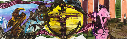 It is not only in his motives that Saks explores and looks for artistic challenges. In his choice of format and painting technique he also challenges the medium of watercolor. With energetic brushstrokes and a forceful, expressive color scheme he breaks with the frailty and transparent nature traditionally associated with paper work.