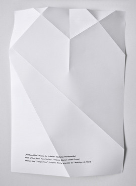 The departure point of this paper work serie is the book Exotic Masks, published in Germany in 1953. Deball replaces the structure of the each mask through foldings. The original images of the masks vanished. It remains an abstract image on glossy folded paper in the size of the book and the ethnographic description of the mask.