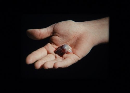 The exhibition at the Kunsthaus Baselland is entitled "Pace", named after the film installation of the same title. Pace is a 16mm film projection behind a wall and a stained glass window, which shows the beating heart of a carp held in the palm of a hand. The slightly insulated noise of the projector and the vibrating of the heart freed from the body form an acoustic symbiosis; the window emphasizes the voyeuristic element in the observation of the image. Montaron examines in equal measure the unpleasant and the beautiful, but leaves open whether this is a "real" or a "fictitious" image.