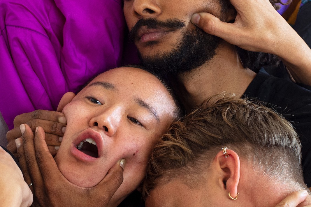 SQUEEZE is a pulsating terrain of vibrant flesh, sliding fascia, muscular release, pleasurable pain, and ever-growing phantom limbs. Sonically accompanied by Nya Bürki aka Graue Kreide, a group of people are busy kneading, squeezing, pressing, pulling, stretching, and shaking each other, driven by an unwavering anatomical curiosity and desire for touch. By experiencing the world through touching, as well as listening and smelling, they ally with the diversity of raw nature. Equipped with pragmatic hiking garments and cosy sleeping bags, they wish to submerge in a both rough and tender environment. The reciprocal relationships between the bodies and the textiles blur the boundaries between caregivers and care receivers, as well as between human and inanimate matter.