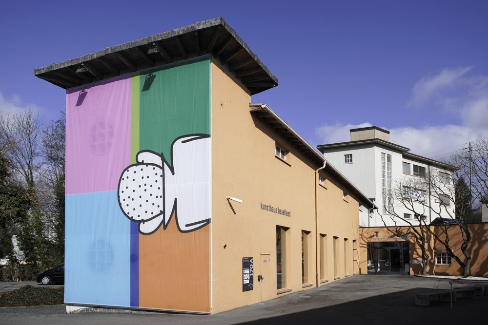 Brodmann has developed a work for the huge surface of the banner which issues from his typical narrative painting, which is often reminiscent of comic scenes. Equally characteristic are subjects which immediately appeal to the viewer’s imagination without ever clearly revealing a narrative. Like this, the work developed for the Kunsthaus could suggest the back of a head or, instead, a cactus; it could be a window motif or it could be a colour plane. As the subject tips from landscape to portrait format it demands a second look and also defers a quick reading. At the same moment the image dovetails with the Kunsthaus architecture, it seems itself to be architectural or sculptural. Temporality is an important aspect of this work — how do we read subjects and narratives, and what changes if these are adjusted, overlapped or tilted? Brodmann’s subject will define the ‘new face’ of the Kunsthaus Baselland for for 10 months.