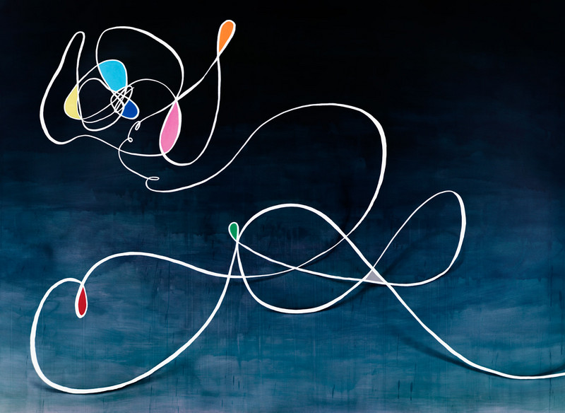 Maier-Aichen uses a combination of analogue and digital methods with technical aspects of photography to derive abstract compositions from multi-layered, constructed scenes. Swooping lines, which appear to be hand-drawn, are in fact analogue translations of digital scribbles. Conceived in the studio using basic tools – camera, lights, hand-painted cardboard foregrounds, colored backdrops, and transparent films – the artist intersperses intricate layers of media to create otherworldly images of experimental and painterly allure.