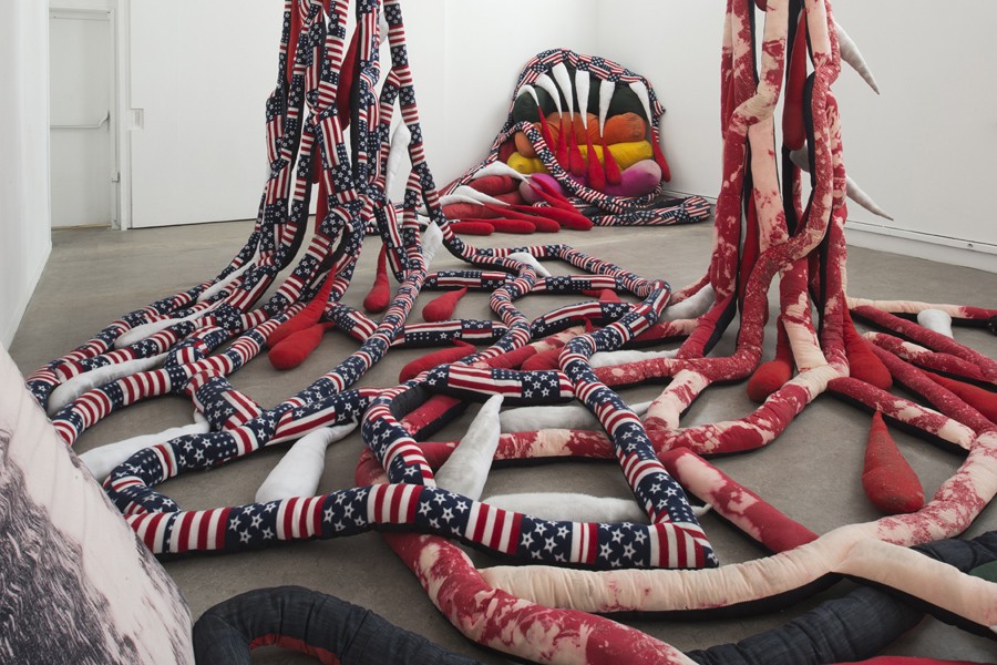 The universe of Soft Work is by first look playful, soft and humorous but will soon reveal a dimensions of fear or terror. The artist transforms pillows, blankets, and quilts from objects of comfort into ominous sculptural objects that hint at the possibility that safety and security are an illusion. Here the American flag is used as material in gigantic vampire mouths and obese stuffed animals hangs from the roof like macerated cadavers.