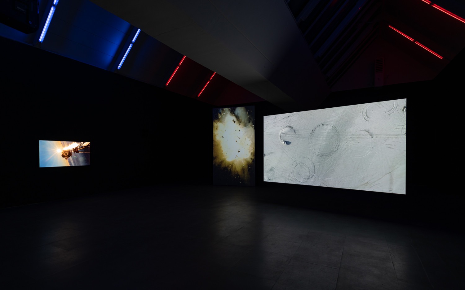 The philosopher Michael Marder describes dust as an element that transgresses the boundaries between temporal modalities, residing in a non-linear, non-sequential time that collapses the “babel” of past, present, and future. “Eternity is time configured as space, or space indistinguishable from time,” he writes, “and dust is its swirling, rolling, disintegrating, and conglomerating image.” In Talk with Dust, Diaz Morales once again returns to the harsh, arid Patagonian landscape that has significantly shaped his artistic language. Spreading across six-channels displayed in two rooms of the gallery, Talk with Dust opens with a vertical projection of road shot from a moving vehicle. With the camera focused entirely on the asphalt, we don’t see any of the surrounding landscape, and with its whirring yellow lines and patchy zig-zags of tar, this view of Patagonia’s route 26 dissolves into something that resembles a Structuralist film more than a scenic drive— thereby setting the tone for a journey without a clear destination. Over the video’s six channels, which unfold over screens of different sizes and orientation, we encounter a slow-burning candle, a drummer improvising, an explosion, and a car cycling endlessly in the desert. Through the viewers’ own movement through space, these isolated occurrences form their own asynchronic narrative and generate a fragmented world—rich mental and material territories on “the other side of the real” where the fantastic resides.