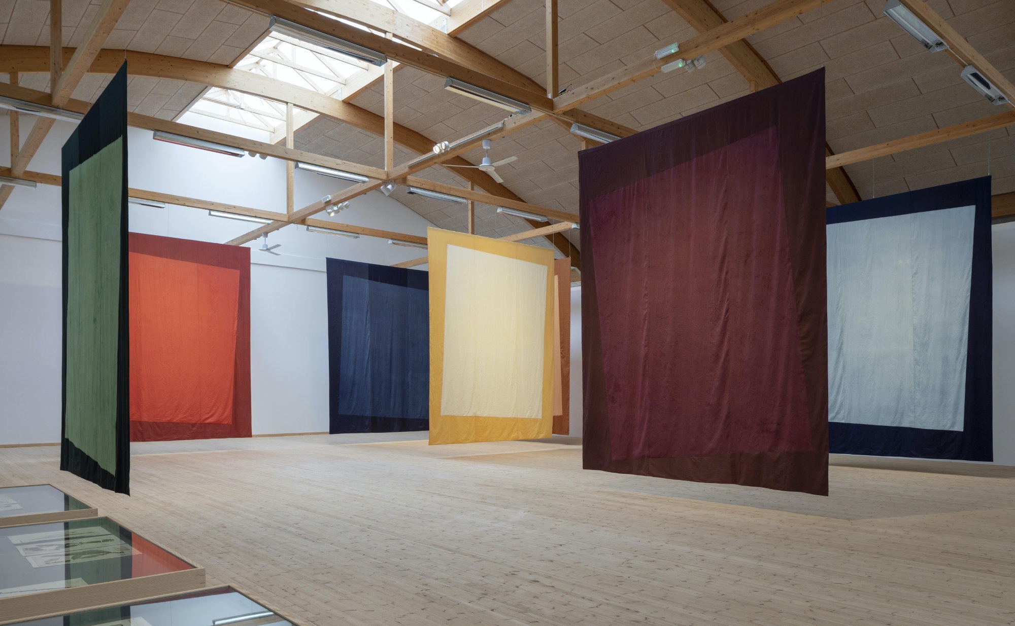 Seven large-scale textile banners coloured with vegetable dyes from the Indian flora extend from the ceiling of hall 5. Using colour pigment extracted from local plants has, for millennia, played a key role in the emergence of myths, traditions, and spiritual rites worldwide. The flags fly like territorial markers above the exhibition, addressing questions on national and cultural identity.