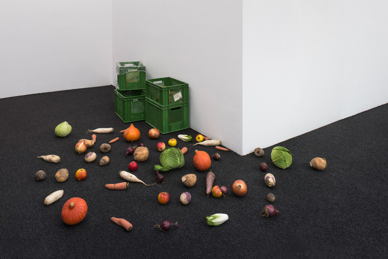 A pair of Hermes ties in Beier’s Office Nature Nobody Pattern, 2014 feature images ofvegetables. Beier has contracted the gallery into several local Vegetable Box Schemes that will deliver fresh produce to the exhibition. When committing to such an enterprise, one automates their choice of sustenance, finding a simplified pathway through anabundance of options. While the schemes tie the customers to the seasons without getting their hands dirty, the neckties are subject to a distinct logic of their own fashion seasons, yet are still regarded as timeless.