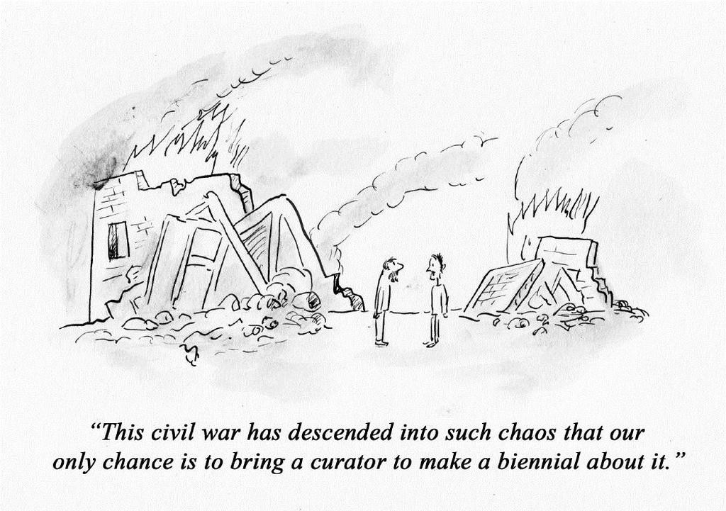 Pablo Helguera, "This civil war has descended into such chaos that our only chance is to bring a curator to make a biennial about it" (2017). Commissioned by De Appel Curatorial Programme 2016-17 for "Why Is Everybody Being So Nice?"