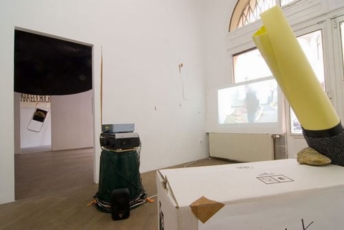 At Layr Wuestenhagen Contemporary, an unusually dynamic counterpoint was set up between the single artist KOKI TANAKA and the collective MAHONY. Like Caldas, Tanaka arrived in Vienna empty-handed, and developed his project using materials found and purchased for the occasion. The main difference with Tanaka’s project, however, was that he used everyday objects to create mini-performances inside the gallery, which were videotaped and presented to the public both as documentation and as post-performance residue. In an adjacent room, a selection of recent objects created by Mahony, including a large handmade banner, referenced a recent expedition to South America, and a third space brought the artist and group together, with individual works that appear as if they might have been made by either one.
