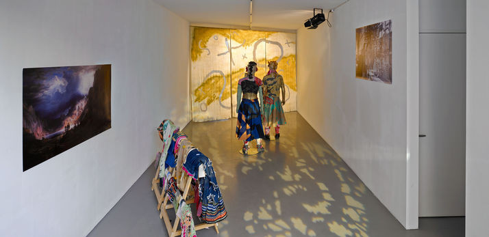 Upon arriving at the gallery, flags with colourfully abstracted texts and patterns, mark the entrance. As we enter, we appear to be “back stage” or at least, in the shadows. Partially transparent curtains filter the light, casting deep projections on the walls. Bodies and space become obscured yet at the same time our movements take centre stage. Moving further, entering the light, we are confronted with other bodies, embellished in folkloric costumes. The garments correspond to narratives and stories stemming from research related to the Radical Faeries, a counter-cultural queer commune movement that emerged in California in the late 1970s. Through employing intensive craft processes and juxtaposing ideas of performativity with politics of refusal and withdrawal, Jones considers what it means to take care of minor histories and how these might be disseminated without requiring full-disclosure.