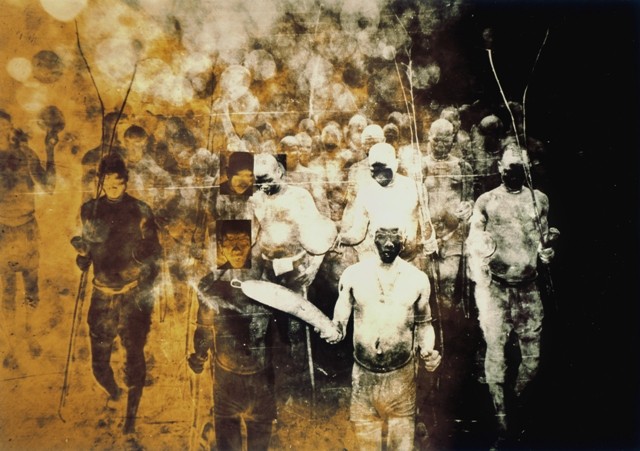 The projection of a ritual scene from a tribal ceremony (Die wiedergefundene Fremdheit/Zeremonie [The recovered strangeness/ceremony]), which Fuchs was allowed to attend and which recurs in his work as a leitmotif, conjures up as a ghostly looking positive-negative collage the transition between the living world and that of the dead. Combined with the objet trouvé, a crutch-ladder, the scenery gets further possible levels of meaning. The perpetuation of archaic customs and modes of thought are hinted at, clinging to traditional myths and belief systems mediated through shamanistic rites, which in many ways still permeate and influence the social structures today.