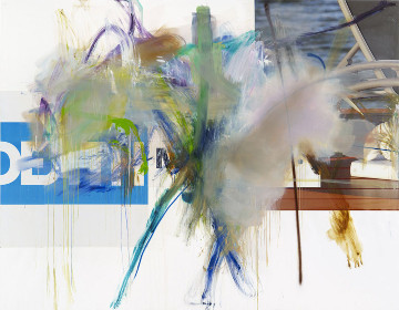 In Oehlen's recent work, flat, figurative cut-outs-all the products of computer-aided design (CAD)—and gestural strokes of oil paint trade places in the service of collage. Revolving around the crisis of the real that is inherent in CAD, the resulting collages tug at the distinctions between man-made and machine-made, representational and non-representational, abstract and figurative, for example in Vulkan (2009), and F (2009) where bright, flat, color-blocked advertisements are disrupted by visceral brushwork. In others, the open-ended, "unfinished" dialogue between binary oppositions is unsettling yet compelling: in any one work, the paint, the collaged pictures and texts, and patches of white canvas each occupy their own space, like a worktable clutter without a center, such as FM 53 (2008-11) and FM 55 (2008–11).