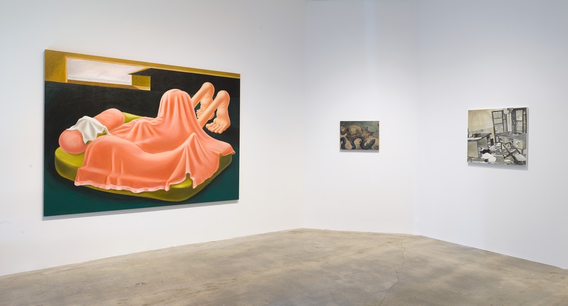 Rife with physiological drama, the fleshy, fabric-draped forms of Bonnet’s Interior with Pink Blanket (2019) exaggerate the human body’s contours to the limits of recognizability. Her eerie composition suggests that in everyday life only the thinnest veneer of propriety masks the grotesque from view.