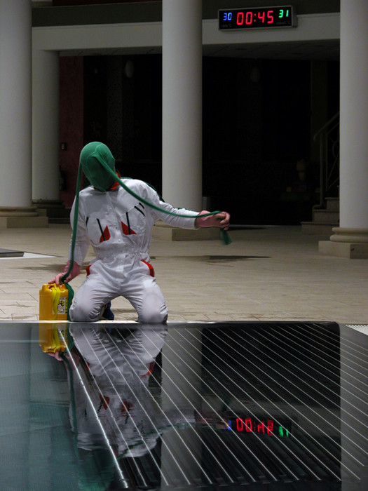 Piotr Baran begleitet sein alter Ego, einen maskierten romantischen Helden, zu dem er selbst ein differenziertes Verhältnis pflegt, auf seinen Streifzügen durch die zivilisatorischen Unwegsamkeiten unserer Zeit. Kreuz und quer steuert er durch Raum und Zeit, entdeckungslustig, sehnsüchtig naiv und mit ausgeprägtem Hang zur exzentrischen Verkleidung. Sein Outfit, wechselhaft, schräg und bunt, verbindet Auffälligkeit mit der Tatsache nicht erkannt zu werden. Die Ziellosigkeit treibt ihn. Obskure Orte im Vorbeigehen. Er macht nicht Station sondern nimmt sie mit. Der Schein von Neonröhren, Dämmerung und Zwielicht, sein Treiben braucht Strahlung. Energie an der er sich fest hält für den Moment der Schwerelosigkeit, des Abrupten oder der Entspannung. Die Austragungsorte mutieren in einem Bruchteil von Sekunden zu bedeutungsvollen Szenerien der Verausgabung, der skurrilen Vollstreckung eines absurden Aktes. Der maskierte Fremde greift in das vermeintliche
