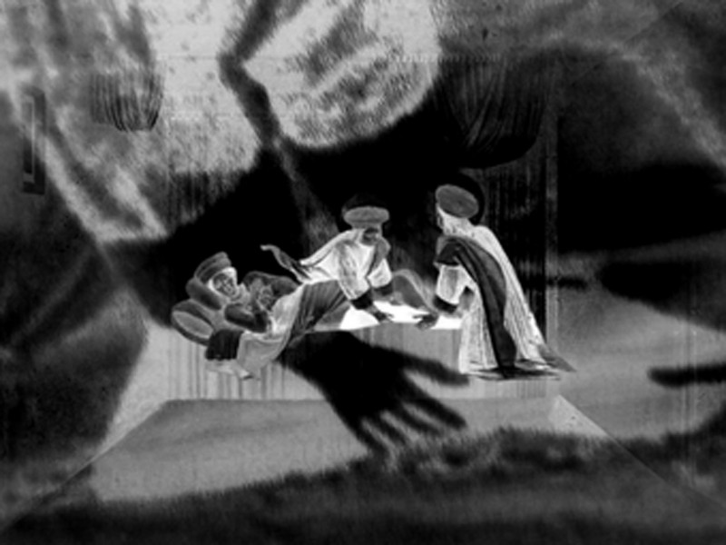 The Angel ́s Black Leg, a tryptic of light boxes, which provides the title for his second exhibition at Conrads, is based upon a painting by Fra Angelico. It depicts the twinbrothers Damian and Cosmas, who perform a transplant operation in which a black leg is being transplanted onto a white patient. They were physicians living in Syria in the 3rd century and became saints later. For Mounir Fatmi, this motif illustrates an attempt to overcome ethnic barriers. However, it is not revealed whether scientific interest prompted this motif or indeed how the experiment turns out.