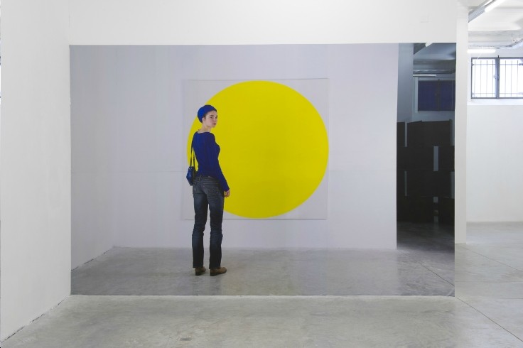 In the middle of the second room, The lady’s not for turning - (Alchemy Box No. 32) (2012) is part of the series of “Alchemy Box”, which experiment with the audience’s trust and belief: the boxes are sealed and contain objects within them, revealed to the audience in a list displayed on a nearby wall. The only way to know if the objects are really in the box is to open, and thereby destroy the box. What is more important? The ideas in the box, the recipe and ingredients for a new work that doesn’t yet exist, or the box that contains them, that appears to be a sculpture and is considered art? This Alchemy Box takes the form of two platforms, one circular and square, that we might expect to find in a drawing studio on which the model may pose. The elements listed on the wall include objects relating to the themes of reconstruction, documentation, as well as the mediated experience. For example, we can read the description of a color photograph taken during the artist’s research, an image leading to the production of the work Tell my mother not to worry (I), also present in the exhibition. I feel more in touch with my practise now than I ever have (2012) is a very large format painting representing the daughter of the artist looking at her father’s work previously shown in 2009 at gb agency—The pen marks on the page suggest the characters head does a double take, moving from left to right rapidly in amazement (2009). This installation was a display of public death notices announcing the death of J. Moriarty, one of the brothers of Sherlock Holmes’ sworn enemy, Profesor Moriarty, and another announcing the death of Mycroft Holmes, one of Sherlock Holmes rumored brothers.The child’s gaze is the only source of light into the painting, as if her naivety and freshness were the only true qualities needed to see things. It’s a hang! (the things you make they mock you, the things you make they mimic you) (2012) is an installation of 83 frames on the wall, carefully arranged in lines. The installation seems apparently disrupted or disturbed: on the left side, a frame is missing and a few others are crooked. They all contain two pages torn from a book made by Ryan Gander on Villa Arson (the architecture, the art school, the museum, Nice...), where in 2006 he exhibited the first version of this installation titled Happenstance. The novel here contains 364 pages of which only 168 are visible. All of the narrative traces have have been deleted, leaving only illustrations and possible solutions in the pursuit of a story («if you continue ahead, turn to page 288»). A fragmented narrative playing with frustration, impossibility to access the completed work and the necessity for the viewer to make up another possible plot. Human’s being human (blue on yellow) (2012) takes the form of an advertising billboard. A young French fashion model dressed in blue is standing within the space of gb agency, surprised by a photographer as she gazed at a painting that consists of a yellow circle on white canvas. But here, the model is not posing, her accusing gaze is directed to the photographer but also to the spectator. Using the codes of the advertising imagery and integrating them into the context of art and its exhibition, Ryan Gander seems to question the intimate relation to the artwork and the fragility of this link. Any velocity that isn’t zero (2012) is a series of eight photographic prints, each a different format and produced using various technology. Each of the images is of exactly the same moment and place but from eight different perspectives. The moment being documented is of Ryan Gander writing a caption to describe and accompanying work. By exhausting the subject and techniques, the artist underlies the impossibility of representing a reality. This self-portrait in reverse, delimited by its outline and not by its center, privileges the reality of the artist in a specific space-time. Here, Ryan Gander deals conceptually with a romantic subject.
