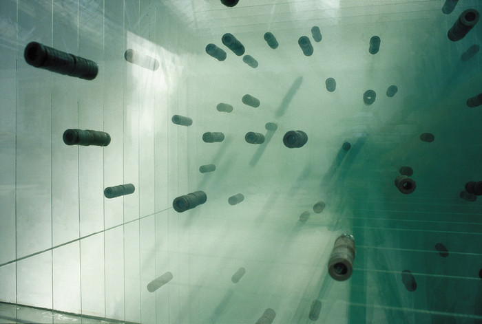 The earliest work on display is the Magnet Spring sculpture, from which the exhibition takes its name. This work from 1991 is composed of twelve panes of glass held together vertically by numerous magnets, letting the hockey puck-shaped magnets to seemingly float in the air. Another work from the early 90s entitled Drawing Machine (1992) Csörgő again employs magnetic forces.