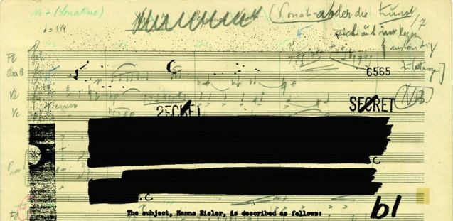 Based on three film music compositions by Eisler, Philipsz has developed a 24-channel sound installation. Recorded individually by live musicians in the studio, each tone is played separately on one of 24 loudspeakers installed in the hall. Through this acoustic work and 12 prints, in which pages from musical scores by Eisler are overlaid with pages from his FBI file, Philipsz attempts to convey Eisler's aesthetic of "displaced form" while touching on themes such as life's journey and the experience of surveillance, separation and displacement.