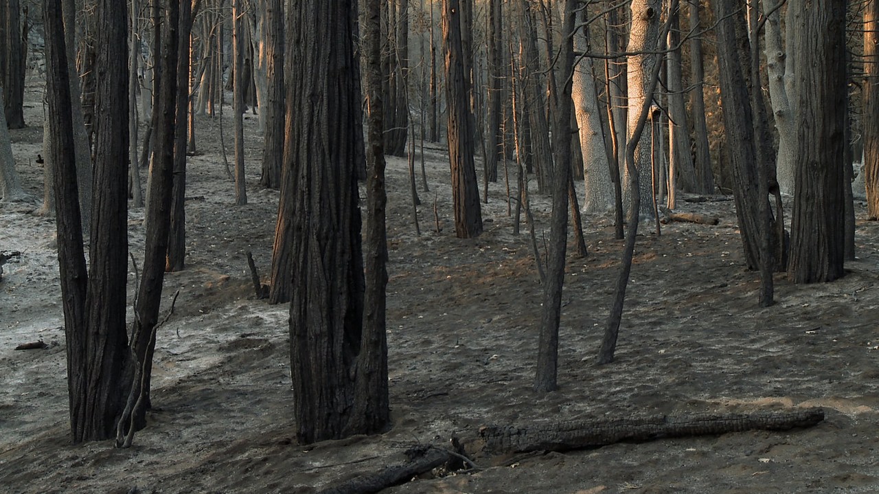 James Benning. Still from Found Fragments (Scorched Earth, Ash 01, RED CLOUD), 2016. Three-channel video installation. Dimensions variable. Color, black and white, 75 min. (loop). Courtesy the artist and neugerriemschneider, Berlin