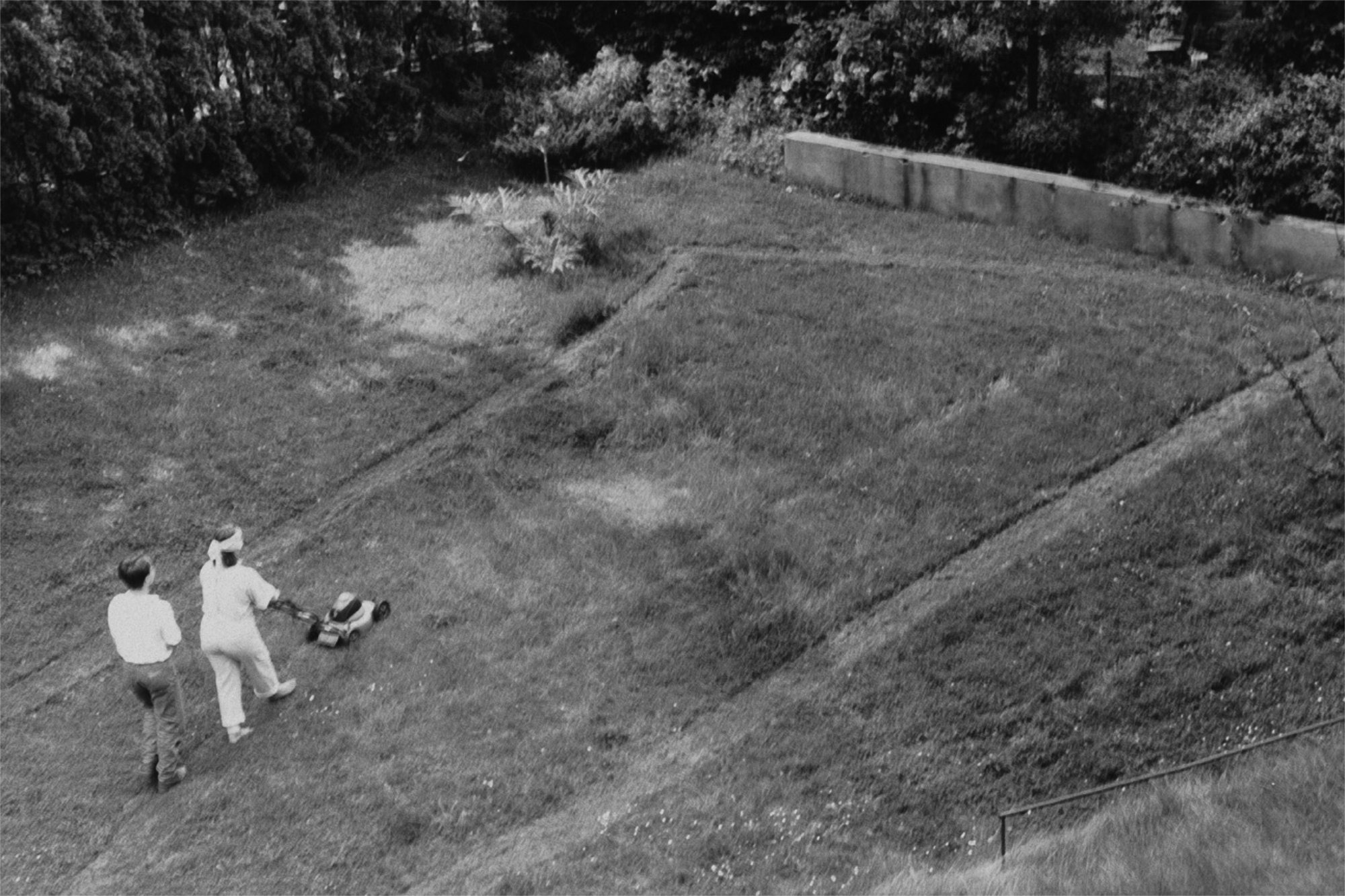 Margaret Raspé, Blindschnitt, 1987, Performance, Lawn mower drawing in the garden of Ruine der Künste, Berlin, photo: Wolf Kahlen, Courtesy the artist