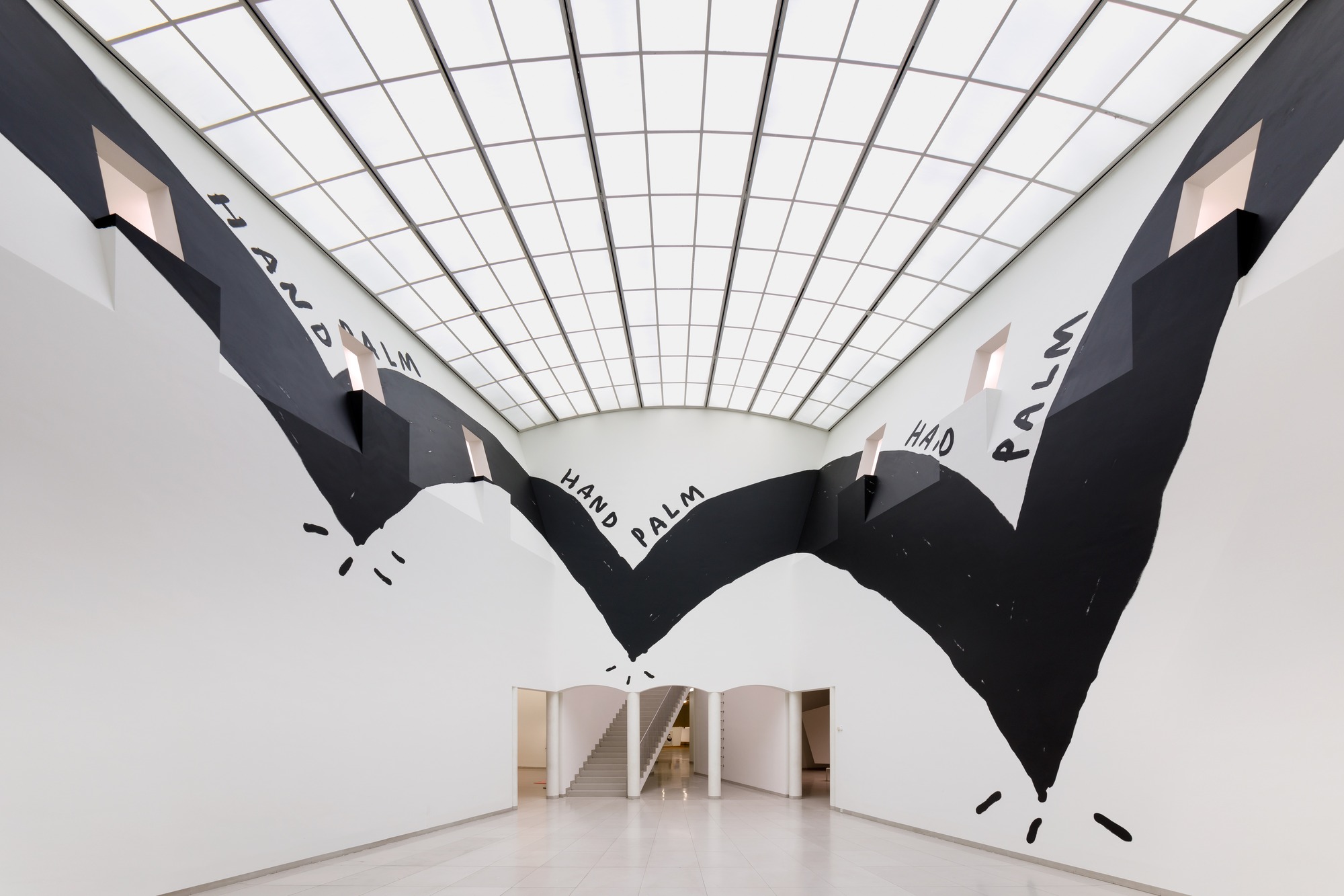 For the Haus der Kunst's Mittelhalle, Kim has created a site-specific, multi-media work that translates the bodily experience of temporality into an extensive, sensory score. The work is composed of static and dynamic elements, that are based on multiply enlarged drawings by the artist. Kim animates visualisations of how numerals are integrated into American Sign Language, including signs that indicate frequency, time, age, and cents.