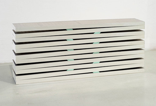 In seiner bereits dritten Ausstellung in der Galerie Hohenlohe zeigt Michael Kienzer minimalistische, reduzierte Installationen, die jedoch alles andere als nicht Raum füllend sind. Eine davon ist ein sorgfältig gestapelter und stabil konstruierter Holzhaufen, respektive Aluminiumhaufen. Rund 200 Stück Holzscheite hat der Künstler dazu in Aluminium gießen lassen. Abgesehen davon, dass das Stapeln und die Verdichtung von Materialien eine zentrale Rolle in vielen seiner Arbeiten spielen, ließ sich Kienzer hier vor allem vom Material Holz inspirieren. Holz ist ein lebendiges Material, Sinnbild für Wärme und Behaglichkeit. Ganz anders das Aluminium, welches „kaltes und totes“ Material ist. „Bei dem Wechsel von Holz zu Aluminium interessiert mich in erster Linie der Transfer von Wärme in Kälte”, so Kienzer. Das Abgießen als künstlerisches Mittel ist Kienzer also deshalb so wichtig, weil dadurch Dinge neu besetzt und wahrgenommen werden können.