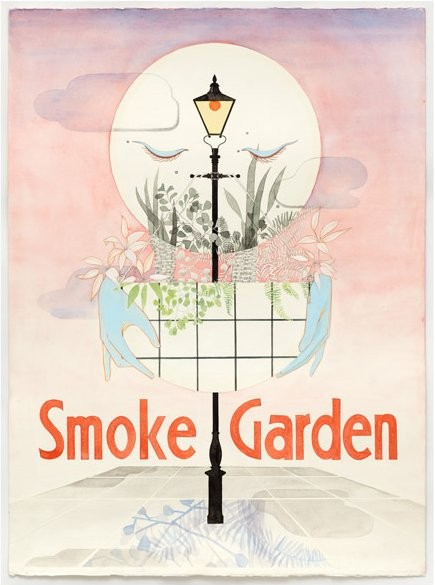 ‘Smoke Garden’ is the title of a suggested performance: a fifteen minute chamber piece to be performed on the percussion instrument The Triangle. It is performed by seven women, and it is staged around a lamppost. The installation in the gallery provides a proposed environment for this performative act, and offers a familiar setting: dashingly elegant female characters in precisely executed colour drawings that are combined with prop-like sculptural elements. The seven women of ‘Smoke Garden’ are represented in various guises, including drawings, painting, and a bronze doorknocker.