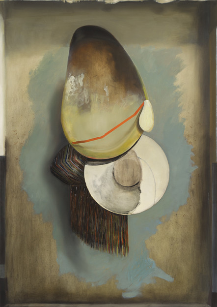 If one is only familiar with Benedikt Hipp’s early artworks, one will perhaps be surprised by this exhibition. While paintings with enigmatic stage situations in front of dark backgrounds were initially the main part of his work, what we now see is a more complex and variegated itinerary with small-format paintings in bright colours, drawings with embedded collages and installation-like arrangements of elements such as sculptures, ready-mades and objets trouvés. A metal linkage meets a bronze cast of two hands meets a golden, sack-like structure meets a stereometric structure of forms meets cheap plastic flowers (room 1), in the next room a silvered horse’s head grows from a 1930’s desk like a feral reliquary (room 2). These are bizarre assemblages of found and made-up objects whose syntax suggests a narration and that can be analysed in analogy to parts of a sentence. But the meaning of this narration vaporises in the inner world of the images and artefacts. Hipp is not a linguist with a propensity for art but a phenomenologist conducting visual studies with pictorial means, so to speak. The faceless figures typical of his work, which we also encounter in the paintings of this exhibition, are therefore no ‘identification figures’ for the beholders but ‘in-dentification figures’. They exacerbate projective contemplation, refer to the imagery of the picture and thus cast the viewers back to themselves, to their own situation, their own body. And where there is the body, there is flesh.