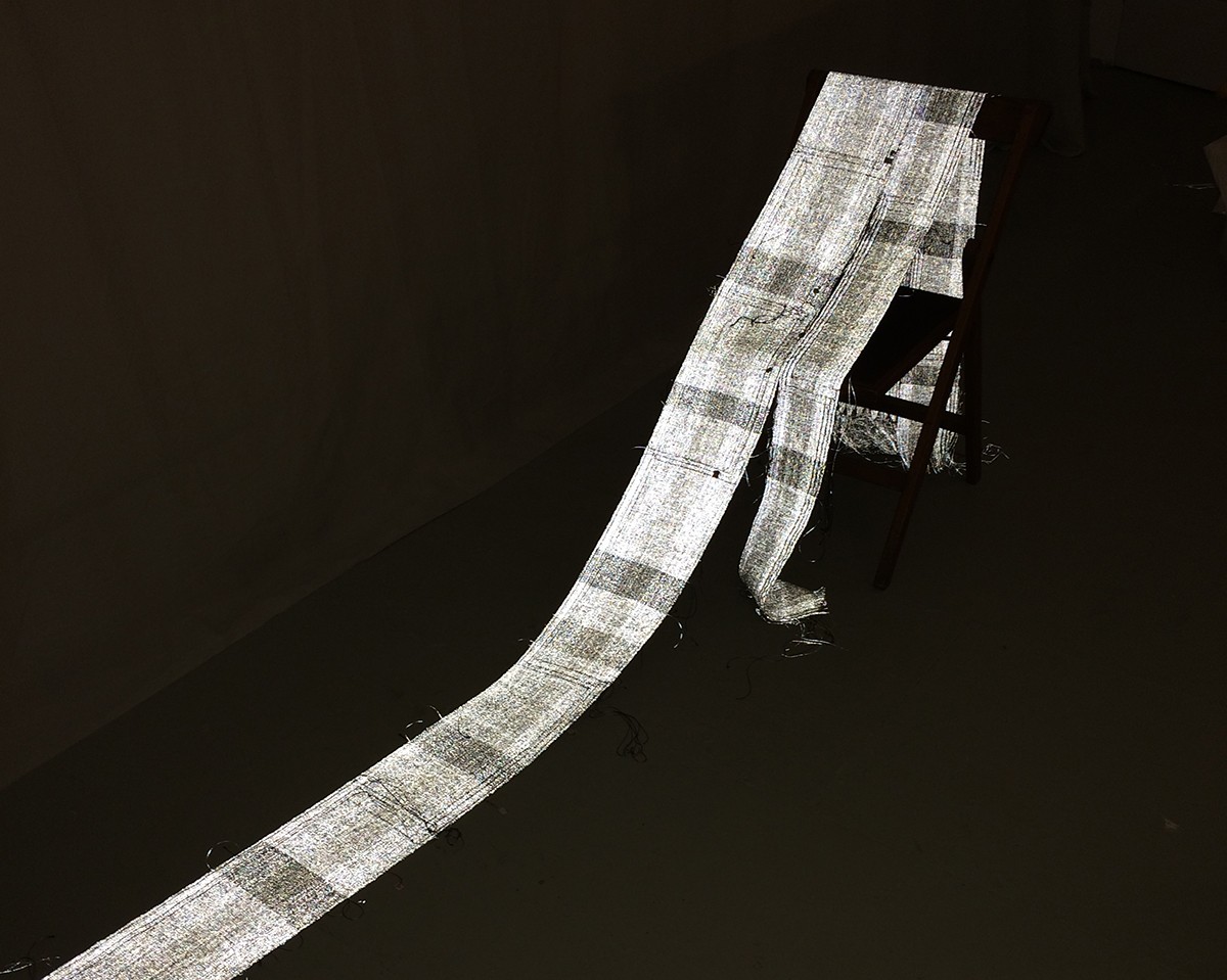 A divided space. A performative gesture of unthreading, or destabilizing, by hand. A fading fingerprint. A tapestry from a material used in radio antennas, heating elements, electromagnetic shielding and safety wear. A short film on the sheer invisibility of its subject matter in a recent study on dark matter phenomena.