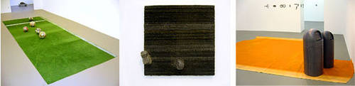Adaptive abilities of Peterman and others are further questioned in an installation of brightly colored tape balls, the auto-therapeutic production of an acquaintance of Peterman’s who as an outsider artist/ ecologist, recycles paper and tape into “useful and educational kick-balls” that exemplify the gospel of recycling and reuse down to the last worthless scrap. The kick-balls are displayed on a remnant of artificial turf from a past installation of Martin Kippenberger’s The Happy End of Kafka’s Amerika. A piece entitled 90 degree rotation of Communal Kitchen Shelf combines a recovered fragment of Peterman’s post-fire building with an accidentally spilled, dough-like blob of plastic. In both pieces, lines of responsibility, intentionality, and authorship are blurred.