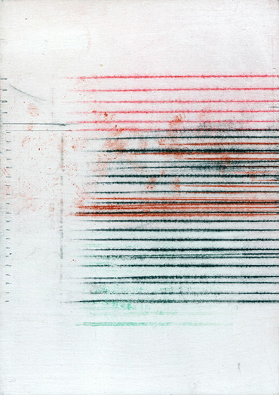 During her time in New York on an ISCP scholarship in 2013, Thorsen started to investigate the workings of the chalk line technique. A chalk line is a tool to help mark straight lines over long distances, mainly used in interior construction work or more generally in architectural processes. Thorsen experimented with chalk lines in her New York atelier, using them in a multi-layered procedure to try and draw straight lines. The resulting works of art were recently exhibited at IMO in Copenhagen and are now on display in a solo exhibition at the Gallery Krobath.