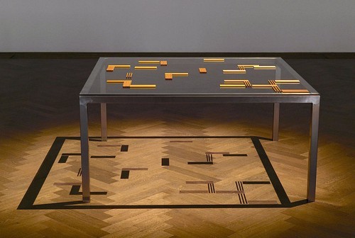 Metal structure, glass and 119 golden painted oak grafite pencils 160x160cm