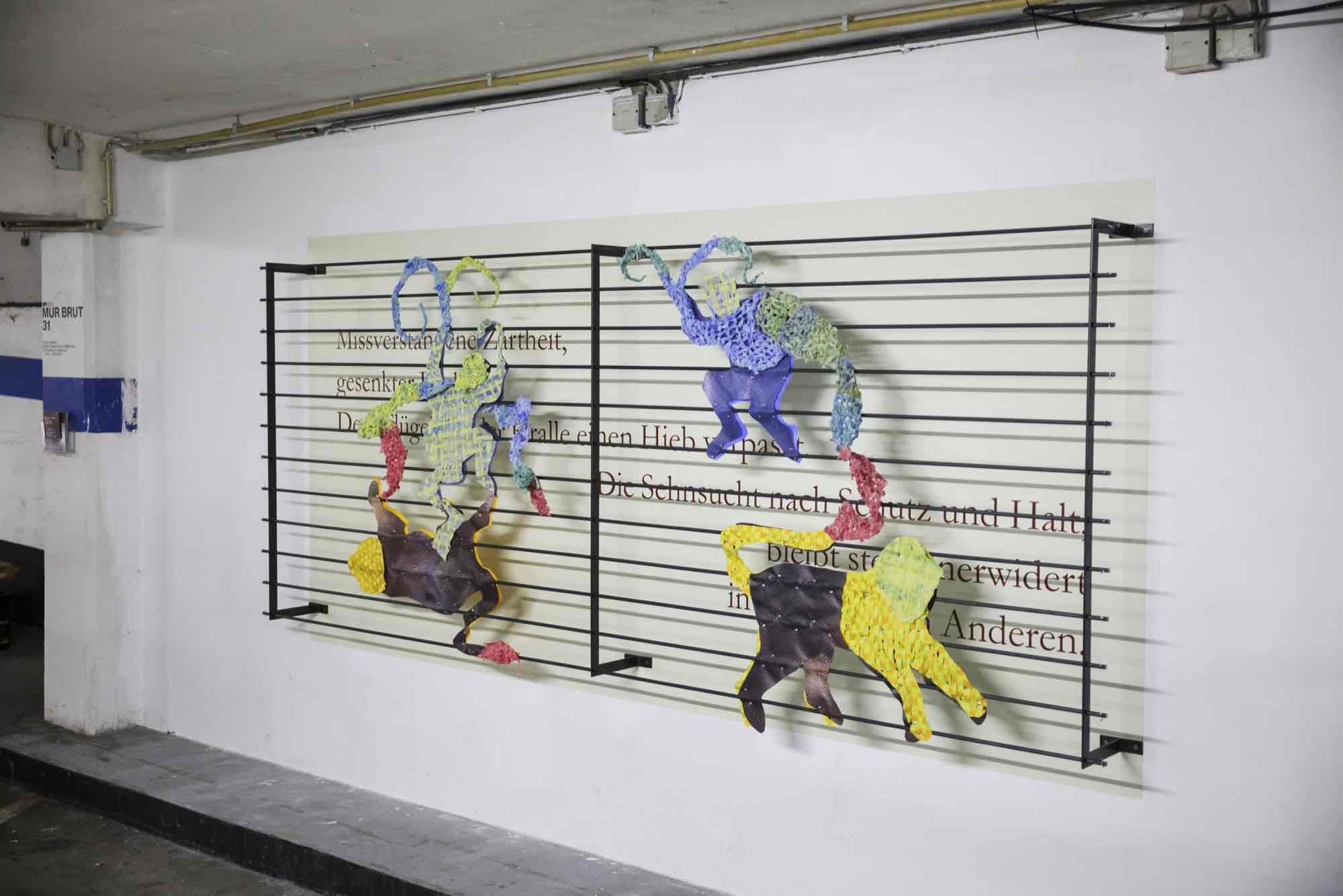 In collaboration with Jana Buch, Linhard explores the unusual union of guardian lions and cherubim as a love story. She highlights the technical and cultural amalgamation of different cultures, symbols, and materials and how these manifest in the context of craftsmanship and trade routes. The installation is augmented by Jana Buch with multiple layers of text on posters, flyers, and the wall itself.
