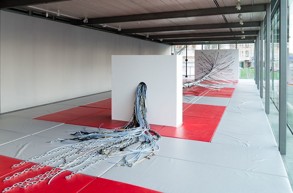 The exhibition includes sculpture, installation and a film, which coalesce to consider the binary power structures of sadomasochism, ritual, authority and control, in order to reveal, through the artist’s distinct visual language, how these roles are both symbolic and reversible. Drawing from a broad range of epistemologies as well as anthropological research, Henrot unravels, fragments, and transforms visual codes into rich registers of information, into hybrid cultural artefacts, and novel material forms. The different elements that comprise the show unfold a choreography and comprehensive dialogue, drawing upon formal structures and raising questions that derive from Henrot’s greater investigation on the human propensity toward dependency.