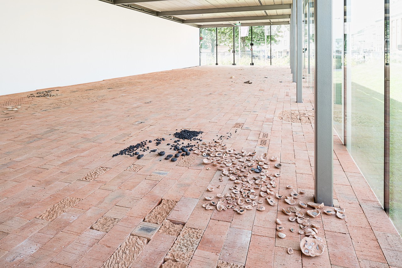 For the exhibition at Kunsthalle Wien Karlsplatz, Newby continues her ongoing engagement with ephemeral and often peripheral situations. Therefore she created a large-scale work installed on the floor in the Karlsplatz building, using bricks as artistic material. For this work, the artist modified unfired bricks and inserted found elements: shattered glass fragments left behind as a result of people spending time outdoors in the Karlsplatz area, and bits of clay collected when the subway was constructed. Through the firing process unexpected formations are produced that imprint the inserted pieces of glass and clay. Newby also adds some small, individual ceramic and bronze pieces that turn out—only upon closer inspection—to be handmade objects. The sculpture unfolds as a material texture that invites visitors to step onto the work, to move across the surface and encounter its details. Discreetly integrated into the exhibition space, the artwork allows the incoming natural light to become part of the installation, and also deliberately encourages the viewers’ gaze to wander outside.