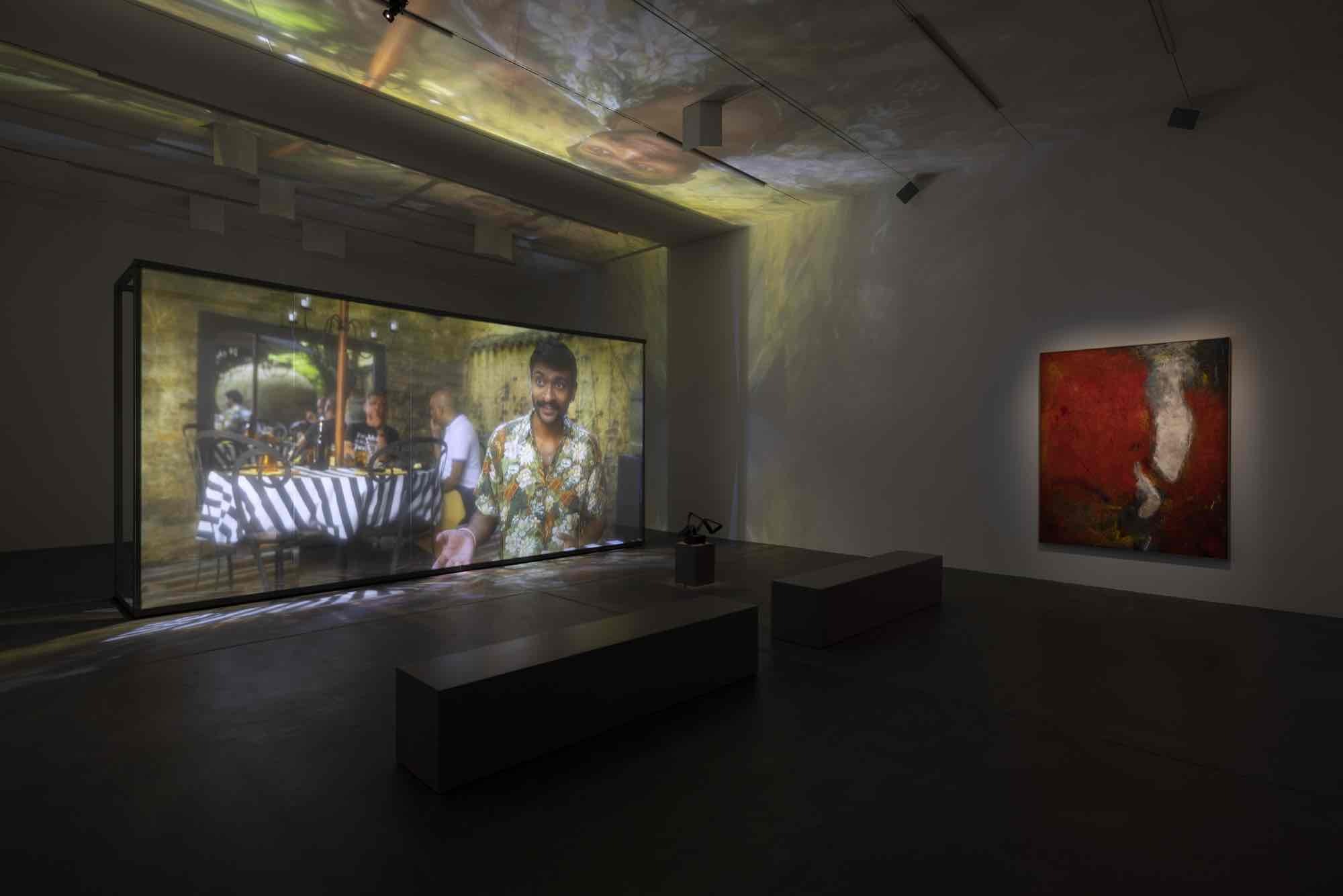 Also on the 3rd floor, in the same space as this series of paintings, is the film installation Being Human (2019), which takes on this question directly, albeit through the prism of human rights and its relationship to contemporary art. A collaboration with curator and producer Annika Kuhlmann, this work was made in 2019 – before Sri Lanka’s subsequent economic collapse – and it briefly features Kulendran Thomas' uncle, who founded a centre for human rights in Tamil Eelam. Looking at a flourishing art scene’s projection of humanist values, the work takes visitors on an elliptical journey around the island at the height of Sri Lanka’s short-lived postwar economic boom, guided by Norwegian-Tamil artist Ilavenil Jayapalan and other guests of the Colombo Art Biennale, including a couple of algorithmically-generated famous figures. Together they all ponder what the ‘human’ is that is protected by human rights and speculate on where it came from. Is it a fiction from the West? Is there an alternative?