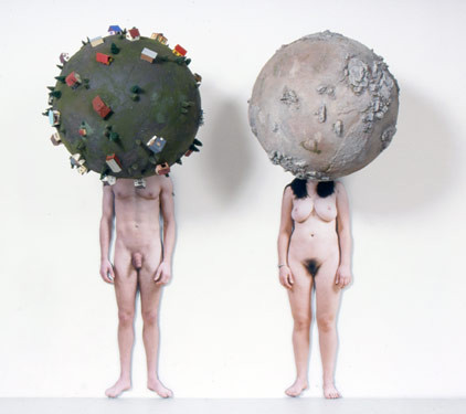 Installation with 2 photos mounted on board (175 x 61 x 13 cm; 162.5 x 61 x 13 cm), and two globes (each Ø 81 cm), styrofoam, acrylic paint, plaster, modell railroad houses