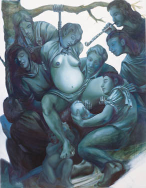 Michelangelo, Géricault, Rubens, Norman Rockwell, Delacroix, Titian, Breughel, Picasso, Matisse, Ingres, Hogarth, Dürer, New Expressionism, the underground cartoons of the East Village, horror films, folk art, kitsch, pornography, Beckmann, Dix and Grosz are associations that come to mind when encountering this artist’s work. In her paintings, groups of naked Amazons romp in grandiose scenes that depict utopian versions of other world orders. Naked, intertwined male bodies hover like clouds or sit in trees above lasciviously bored women; archaic social rituals encounter futurist visions and are turned topsy-turvy; sexual promises in art and the media are bitingly undercut with a great deal of humour and reformulated from an explicitly lesbian point of view.