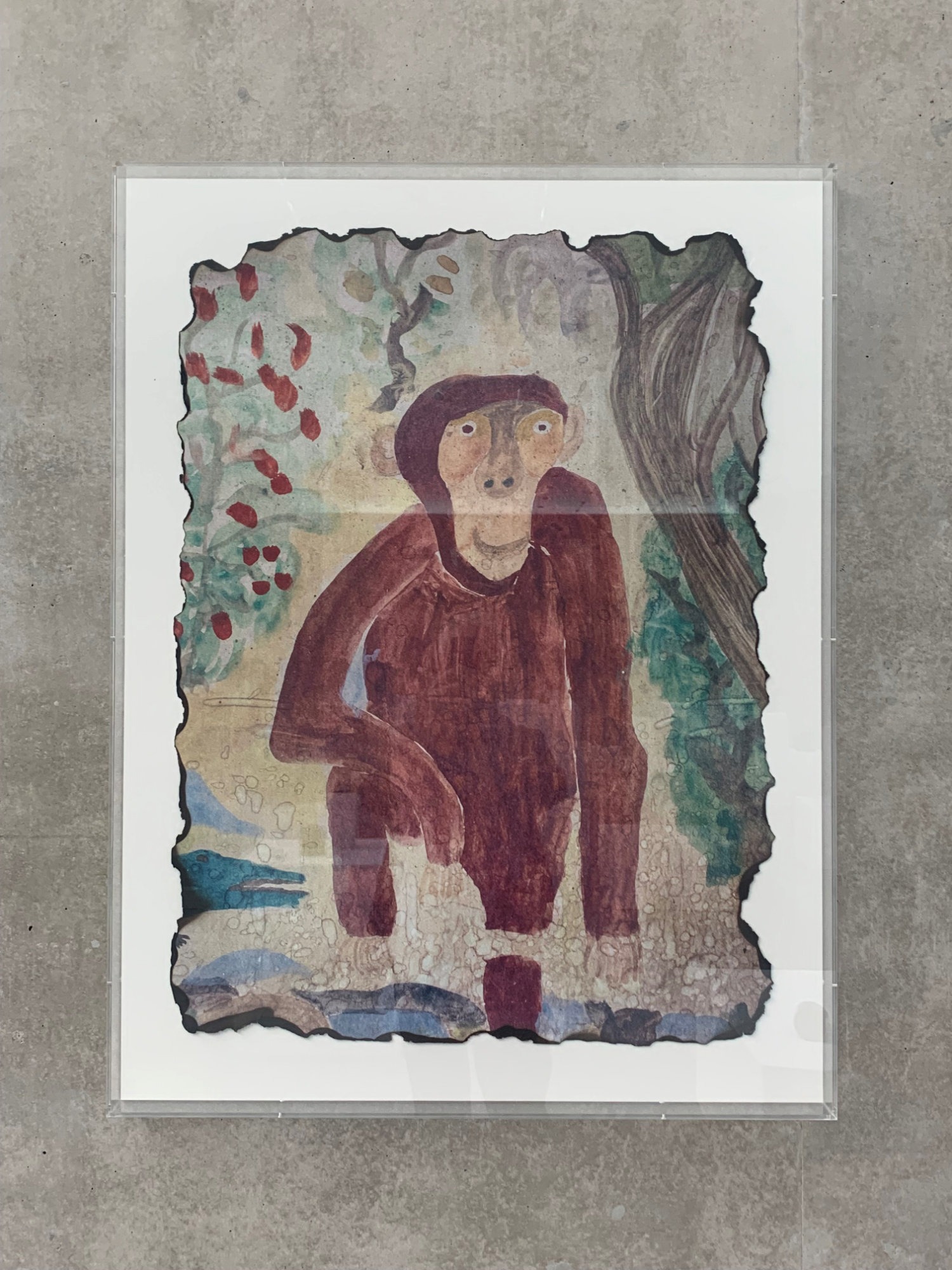 On the second floor there are 24 variations of the monkey. The reliefs, displayed on plinths, form a collection of yellowish sculptures. The original, which Peter Fischli has also developed as a lithograph, is on display on the first floor. The artist painted it when he was ten years old.
