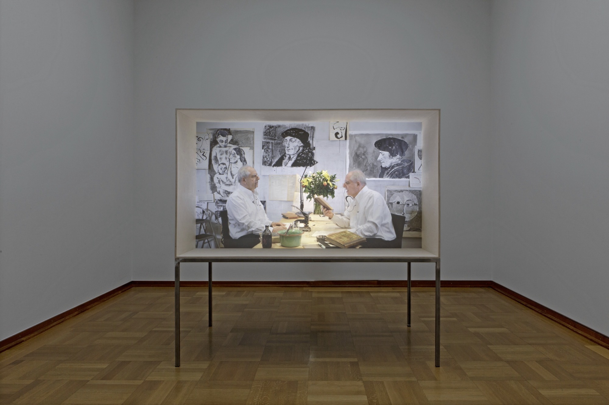 In Praise of Folly (2018), the title of Drawing Lesson No. 50, which makes its debut in Basel, is borrowed from the satirical speech that Erasmus of Rotterdam penned in 1509, a biting critique of the Catholic Church. The humanist scholar is a major figure in the history of Basel, where he taught at the university and is buried. Sketches by the artist that can be made out in the background in the film quote Hans Holbein’s Portrait of Erasmus of Rotterdam, one of the most cherished treasures in the Öffentliche Kunstsammlung, Basel’s municipal art collection. The attentive viewer can also spot sketches after other well-known works in the Kunstmuseum’s collection, including by Pablo Picasso, Paul Klee, and Matthias Grünewald, that grace the walls of Kentridge’s atelier like icons. In light of these works, In Praise of Folly addresses art history and the masters of the past as a source of creative inspiration for the artist working today.