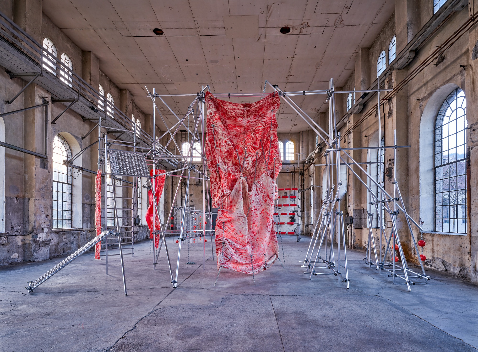 Sophie Hirsch invites us to an encounter with ourselves at Kunstraum Dornbirn. Entering the former assembly hall, we find ourselves looking into our innermost being. A huge, two-part sculptural image hangs from a height of around six metres. Our first impression is that we are gazing at a close-up of motionless, glued-together fascia or flesh streaked with fat: cream-coloured, shiny silicone, hand-moulded, parasitically connected with a rich red fabric, each part three by four metres. Eyelets puncture the layers at points, providing openings for round steel chains and tension springs. The impression is violent and fascinating at the same time: a range of intimate emotions unfolds – shocking and brutal, beautiful and repulsive, irresistible and attractive.