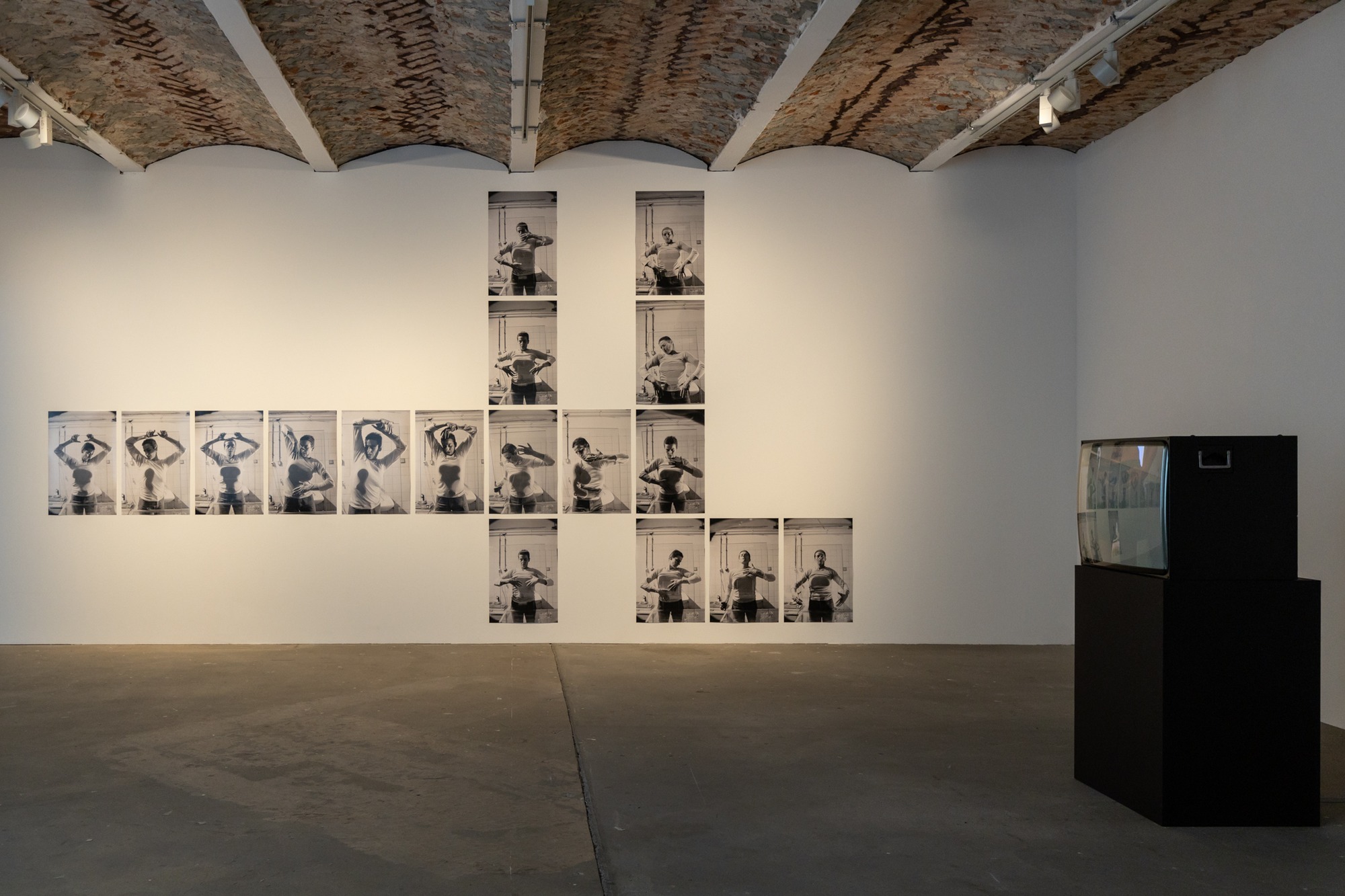 Back: Anna Daučíková, Upbringing by Exercise, 1996/2016, 17 b/w-photographs; front right: Anna Daučíková, We Care For Four Eyes II, 2002, HD video; installation view of the exhibition, KW Institute for Contemporary Art, Berlin, 2019, Courtesy the artist, photo: Frank Sperling