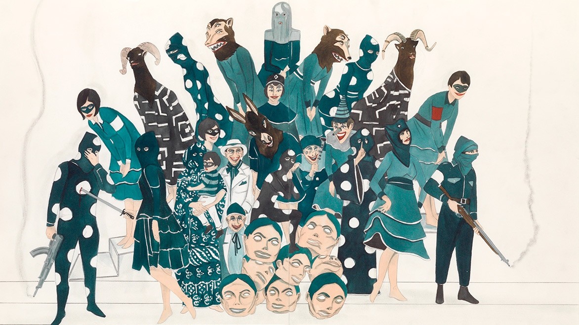 Masquerade, irony, the use of costumes and characterisation fill Marcel Dzama’s world with life and death, music, calm and violence. A cosmos in which opera singers and even nature mingle with Donald Trump himself in The Love of All Things Golden (2017). Drawing on a Revolution is an invitation to reflect upon our present world through the constant cross-references included in the work of Marcel Dzama.