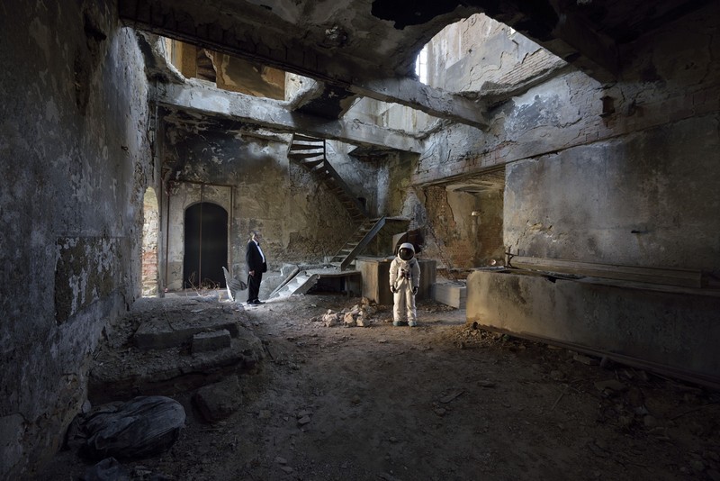 For his debut at Lisson, Akomfrah is presenting three new film installations, alongside a series of large scale photographs related to the works. The first work, The Airport (2016), is a three screen film installation which recalls the work of two filmmaking greats: Stanley Kubrick (1928-1999) and Theo Angelopolous (1935-2012). The film’s narrative, complete with sweeping shots of the landscapes of Athens and Southern Greece, contemplates the significance of empire, and the ghosts which linger in our collective consciousness – both physically through architectural ruins and metaphorically through the traces and personal histories of previous generations. The film’s elastic sense of time, where characters from different eras and generations encounter one another references Stanley Kubrick’s masterpiece 2001: A Space Odyssey (1968). Angelopolous’s technique of employing constant movement between camera, characters and locations is also reflected to poetic affect.