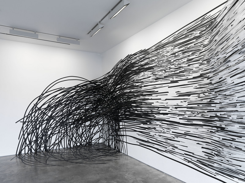 An installation by Susan Hiller, Work in Progress (1980), contains the residue of a week-long performance by the artist, which involved unravelling the canvas of a painting into its component parts, each day the resulting threads re-configured as a ‘doodle’ or ‘thread drawing’. Using the soft material of tape, Berlin-based installation artist Monika Grzymala and Seattle-based artist Victoria Haven create new site-specific works for the exhibition: Grzymala’s durational piece creates a densely crosshatched maelstrom blizzard of black, in contrast to Haven’s minimalist and geometrical abstractions; their delicate compositions worked out and painstakingly painted in advance.