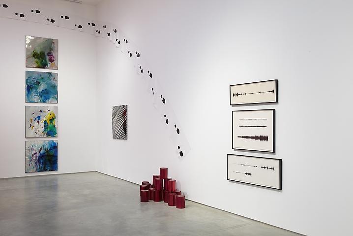 The exhibition begins with Yuichi Higashionna’s fluorescent light chandelier installation as it immediately reveals our excesses and pretensions while Aiko Miyanaga, through an innovative use of Naphthalene, an aromatic hydrocarbon most commonly used in mothballs, creates a decomposing clock . Through its natural sublimation process, the work reminds us of our losses, memories and transformations. In contemplations of time, this clock is constantly changing in form, akin to the life and work of the artist Akira Kanayama. A significant member of the Gutai Art Association, Kanayama occupied a rare place in the history of Japanese post-war art. Footprints, originally made in 1956 for the legendary 1st Gutai Outdoor Exhibition, was his attempt of automatism by making marks in space and recording them on a long narrow roll of plastic. In 1992, Kanayama broke his twenty-seven year artistic silence as he further transformed automatism into a realm of extreme subtlety and finesse through his visual renderings of classical music recordings made by way of a sound-analyzing machine. It is to his singular efforts in transforming his vision and approach to which the exhibition subtitle, “When Vibrations Become Forms” is dedicated.