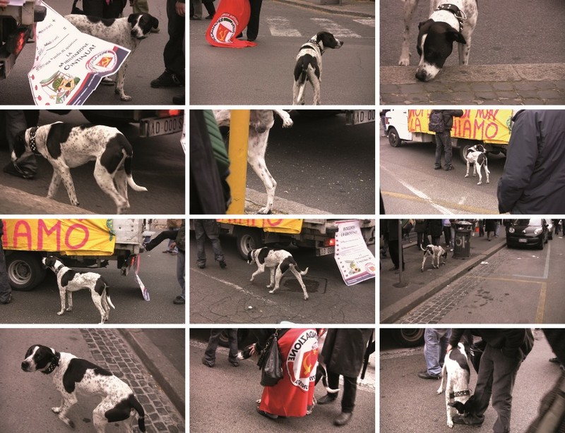 In his recently produced wall installation called “Still. Silhouettes Movement Buenos Aires – Carinthian Partisans” (2011), Hannes Zebedin addresses a repressed chapter in Austrian history, the partisan struggle of Carinthian Slovenes against Nazi military forces. By referring to the Argentinian protest movement’s practice, Zebedin copied the body contours of Partisan fighters directly onto kraft paper. In the video “Untitled” (2009) Zebedin follows a street demonstration in Italy from a specific perspective: his camera exclusively captures a dog that accompanies the crowd of protesters.