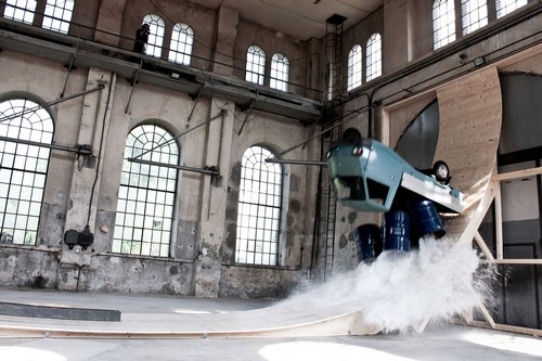 Having been invited to participate in numerous international solo and group exhibitions at prestigious institutions, Signer, born in 1938 in Appenzell, is one of the most important artists of our day. In his fourth solo show at Galerie Martin Janda, nearly all of the works he presents have not been exhibited before, and some were created expressly for the gallery’s spaces. Since the 1970s, Roman Signer has been working with carefully selected banal objects (e.g. a table, a chair, a box), as well as with different kinds of vehicles (a Piaggio, a bicycle or small wagon) which are propelled, deformed or destroyed with the assistance of different sources of energy. In the current exhibition, model helicopters have the leading role: they are lined up on a board like a squadron in a wooden booth. Some of them have slid through a Plexiglas tube and landed in a pile on the floor in front of the booth. Others are lodged like trapped insects in a tube nearby.