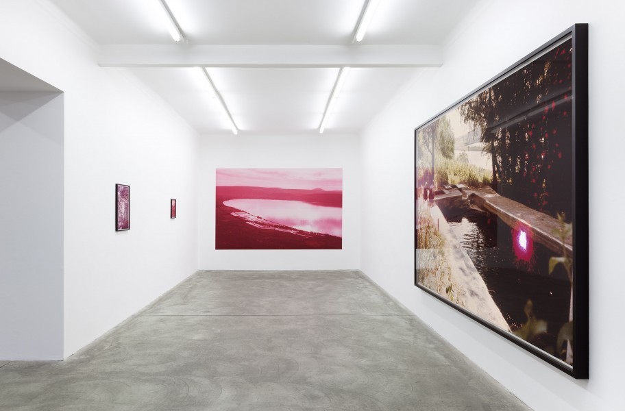 The first part of the exhibition comprises blow-ups of slides from the late 1960s that have lost and changed their colours over time. These “found-footage” pictures were taken by soldiers and amateur photographers in the north of Israel and were used as teaching materials for didactic lectures. Water and lush nature form the dominant and connecting elements of these photographs, with the formerly green-blue scenarios now dipped in red, bearing testimony to the past utopia of a “new Europe” in the Middle East; an idea of nature and landscape which many immigrants from Europe and Russia followed and tried to implement upon arrival. The Sea of Galilee 1969 (2016) shows Lake Kinneret from the east; a view which not only stresses the significance of the lake as the region’s main water source but also emphasises its religious, historical and iconographic dimension. Officers’ Pool 1969 (2016) takes us to the Golan Heights where a pool was built for soldiers of the Syrian army in the 1960s at a natural well. Decades later the pool became an attraction for hikers and nature lovers. Leisure, recreation and escapism merge with politics and history.